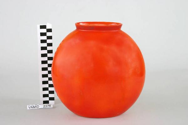Vaso circolare schiacciato in profondità. Smalto rosso-arancio.
