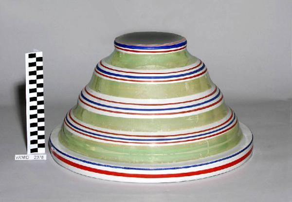 Piedistallo a forma troncoconica gradinata. Decorazione data da strisce di colore diverso (blu, rosso e verde lustro) alternate al bianco della vernice.
