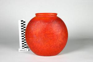 Grande vaso circolare schiacciato in profondità. Smalto rosso-arancio con effetto macchiettato, irregolare, all'esterno e lungo il bordo interno.
