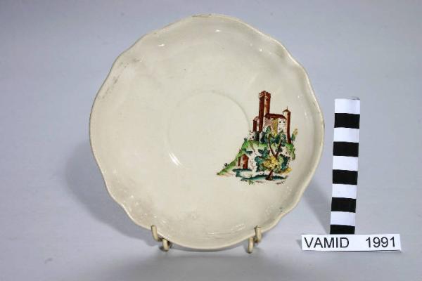 Piattino con bordo di forma irregolare. Decoro nei colori marrone, verde, giallo e azzurro su fondo bianco.