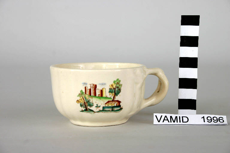 - NOTIZIE STORICO CRITICHE La tazza appartiene a un servizio da thè di "forma Pescara" o "forma Vecchia Milano". L'oggetto è decorato con transfer di colore marrone, colorato a mano sotto smalto in verde, giallo e azzurro.