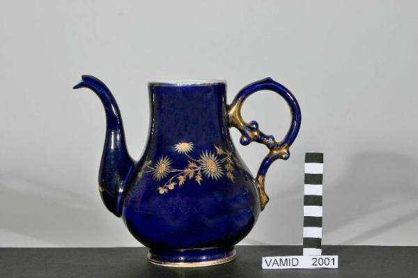 - NOTIZIE STORICO CRITICHE La caffettiera (recipiente inv. n. 2001, coperchio inv. n. 2002) fa parte di un servizio in blu cobalto databile tra la fine dell'Ottocento e l'inizio del secolo successivo. La coloritura blu è eseguita sottosmalto mentre i fiori sono realizzati in parte a rilievo a terzo fuoco in policromia e con oro brillante.