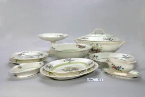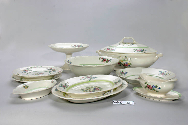 Servizio da tavola composto da una zuppiera con coperchio, una salsiera, una raviera, un piatto piano, un piatto fondo, un piatto da frutta, un piatto da portata ovale grande, un piatto da portata ovale piccolo, un'insalatiera, una fruttiera, un piatto da portata rotondo.