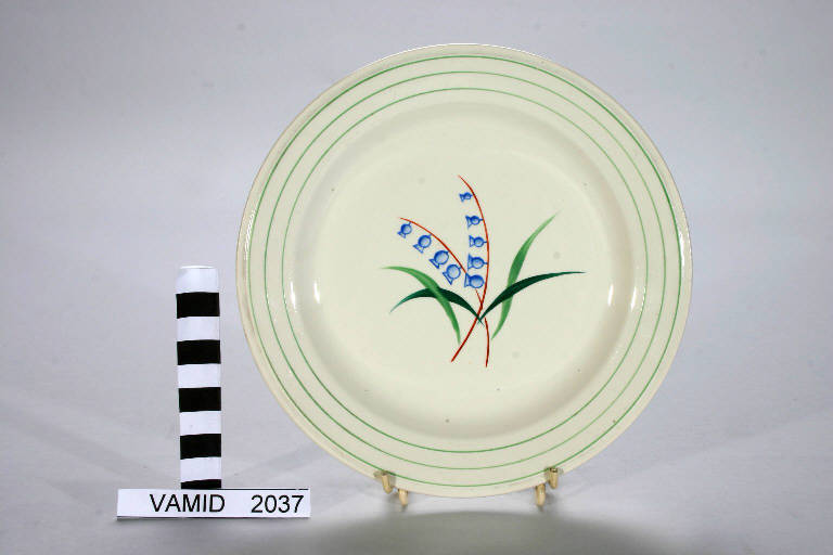 Piatto da frutta con bordo liscio segnato da una triplice filettatura verde. Fondo bianco.