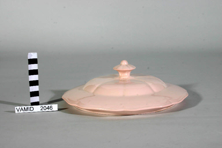 Zuppiera in pasta rosa con corpo suddiviso in otto fasce verticali sagomate e con due manici alle estremità. Coperchio di forma gradinata ripartita in otto petali con pomolo sommitale a piccolo vaso.