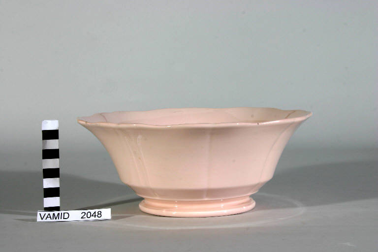 Insalatiera in pasta rosa con basso piede strozzato e corpo svasato suddiviso in otto fasce verticali sagomate.