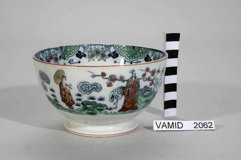- NOTIZIE STORICO CRITICHE La ciotola è decorata mediante transfer nero applicato sottosmalto. E' poi colorata a mano con lustro colore rosa pesca sottosmalto e rosso e verde soprasmalto.