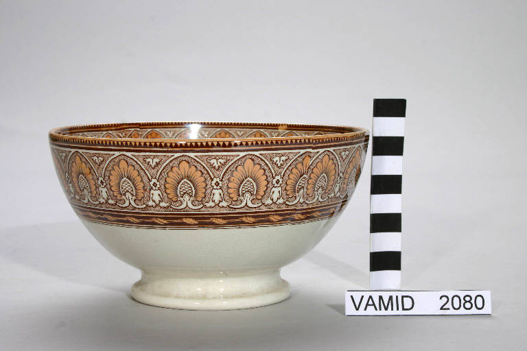 - NOTIZIE STORICO CRITICHE La ciotola presenta un decoro utilizzato tra Otto e Novecento con il nome "Tancrede" dalla società franco-tedesca Villeroy & Boch. In mancanza di marchi non è possibile definire esattamente la manifattura: potrebbe anche trattarsi di un'imitazione. Il manufatto è decorato con transfer di colore marrone, colorato a mano con lustro colore pesca. E' da notarsi la sovrapposizione del transfer lungo il bordo superiore