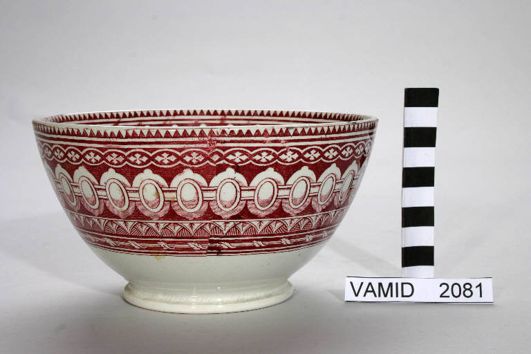 - NOTIZIE STORICO CRITICHE La ciotola presenta un decoro geometrico in bordeaux, applicato a transfer. E' ben visibile il punto di congiunzione della decalcomania lungo il bordo.