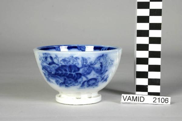 Ciotola decorata in blu cobalto all'esterno con composizione di foglie e fiori e all'interno con bordo a piccole foglie e motivo floreale sul fondo.