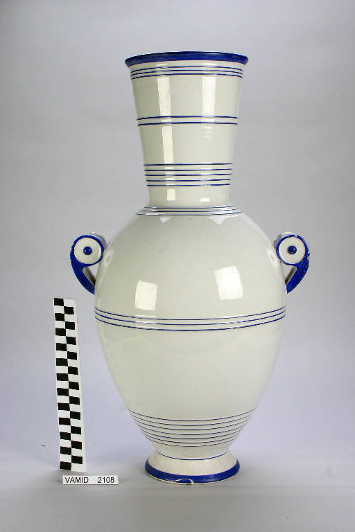 Vaso dalla forma ad anfora con piede circolare, corpo ovoidale guarnito di due manici a voluta e collo troncoconico.