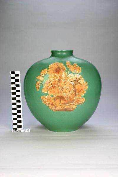 Vaso portafiori panciuto con stretta imboccatura dall'orlo estroflesso; smalto verde opaco con decorazione a rilievo nella pasta sulla parte frontale, smaltata quest'ultima di beige.
