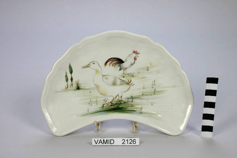 Piatto mezzaluna con orlo festonato; fondo color bianco avorio con decori animali in policromia.
