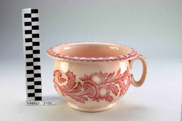 Pitale in pasta rosa panciuto con orlo estroflesso e manico a "C"; decoro vegetale color porpora stampato sul corpo, sul manico e sull'orlo.