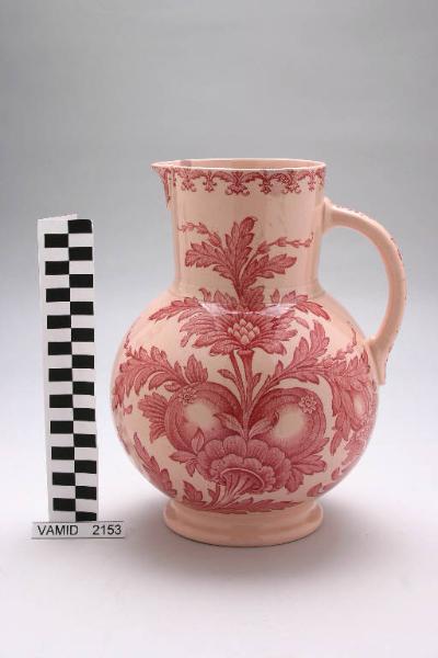 Brocca in pasta rosa con corpo globulare, collo cilindrico, beccuccio appena accennato e manico a "C"; decoro vegetale color porpora stampato sul corpo, sul collo e sul manico.