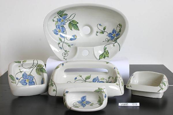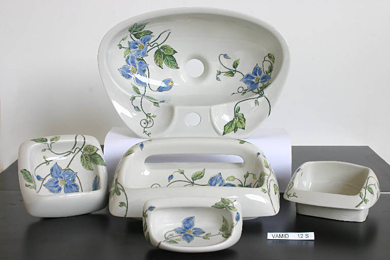 Servizio di accessori da bagno in pasta bianca composto da un portacarta, due portasapone e un maniglione.