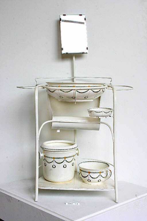 Servizio igienico da camera in ceramica decorata composto da un pitale, un catino, un portasapone, un secchiello con bacinella-coperchio e da un supporto metallico con specchio.