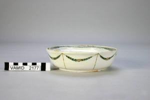 Portasapone composto da un recipiente circolare entro cui è fissato un coperchio concavo con fori per far defluire il liquido rimasto sul sapone dopo l'uso; decoro in giallo e verde con motivi a festoni e ghirlande, bordura a foglioline.