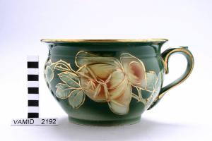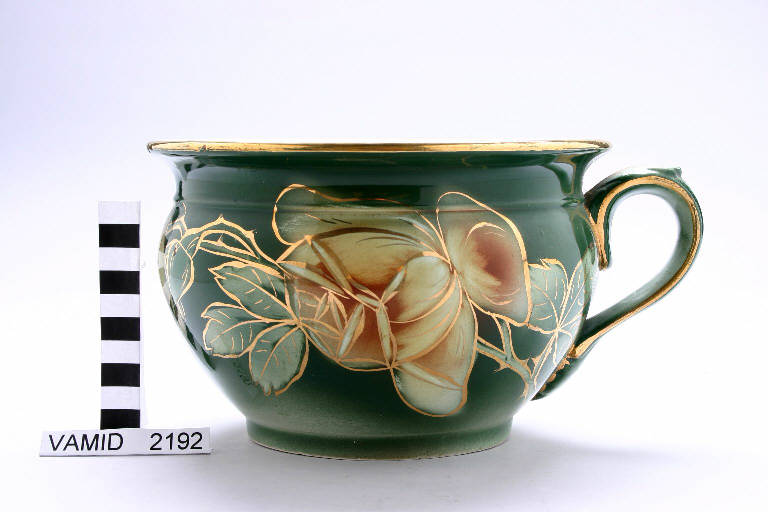 - NOTIZIE STORICO CRITICHE Il pitale fa parte di un servizio igienico da camera finemente decorato. Sullo sfondo verde realizzato con aerografo è eseguita la decorazione interamente sottosmalto nei colori giallo, verde pallido e marrone. Tutti i contorni sono rifiniti in oro brillante, che è utilizzato anche per segnare l'orlo superiore e i profili del manico. Il termine ante quem è l'anno della fusione della Richard con la manifattura Ginori, con la conseguente modifica della ragione sociale in Richard Ginori.