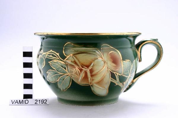Pitale con manico a voluta decorato a rose e foglie su fondo verde sfumato; lumeggiature e rifiniture in oro brillante.