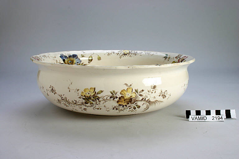 - NOTIZIE STORICO CRITICHE Il catino fa parte di un servizio igienico da camera decorato con transfer di colore marrone a motivi floreali. La policromia è stata quindi applicata a mano sottosmalto.