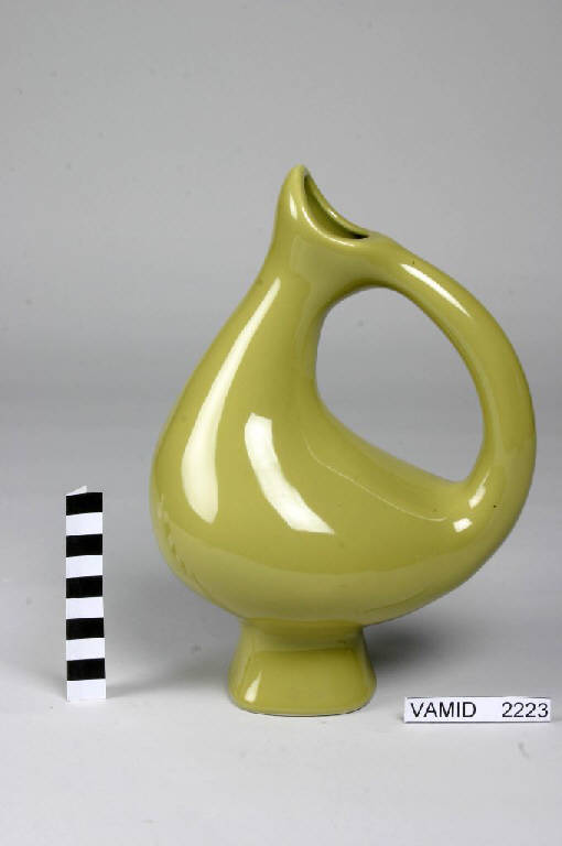 - NOTIZIE STORICO CRITICHE Il vaso, prodotto in serie con la denominazione "C. 7 ", fu eseguito da Antonia Campi in varie coloriture a monocromo e in bicromia nell'ambito degli "articoli di fantasia". Fu uno dei primi oggetti progettati dalla Campi per la produzione in serie insieme ai vasi C. 5 e C. 8. Questi oggetti sono inviati al concorso di Faenza del 1949 e saranno subito accolti nelle collezioni del Museo internazionale delle ceramiche. Il vaso C. 7 è una brocchetta a "col cabré" dalle analogie zoomorfe, una tonda pollastra in terraglia che anticipa quella fluidità e flessuosità celebrate nel servizio Ulpia di Giovanni Gariboldi presentato alla Triannale di Milano nel 1954. Alla fase creativa degli "articoli di fantasia", protrattasi dal 1948 al 1958, corrisponde uno stile eclettico che coniuga l'astrazione e l'analisi geometrica con il gusto per i "non colori" come il bianco e il nero, con un forte organicismo e un surrealismo baroccheggiante. A queste sperimentazioni della Campi segue, dall'inizio degli anni '60, un'"avanguardia di massa" ceramica, sovente imitativa e triviale, che trae spesso ispirazione dalle sue creazioni.