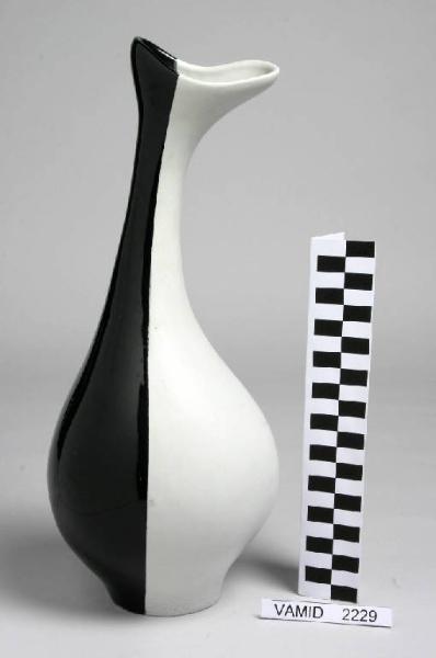 Vaso asimmetrico panciuto con collo alto e stretto e imboccatura "a boccaglio", smaltato all'interno e all'esterno in bicromia bianco opaco-nero lucido.