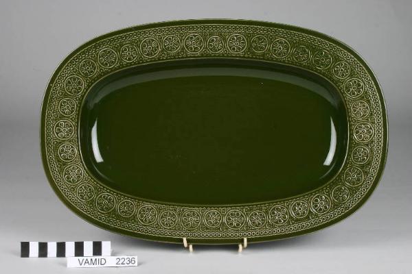 Piatto da portata ovale color verde scuro con motivi decorativi geometrici e vegetali a rilievo lungo la tesa.