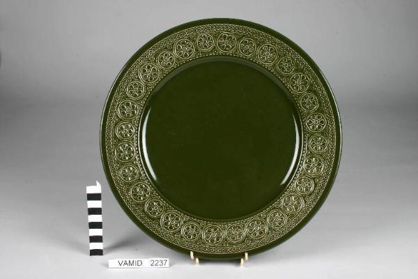 Piatto da portata circolare color verde scuro con motivi decorativi geometrici e vegetali a rilievo lungo la tesa.