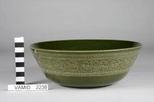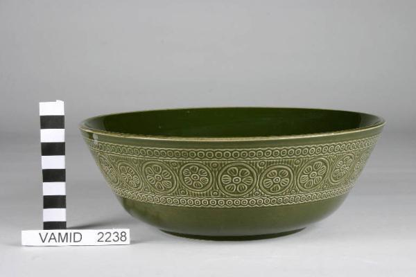 Insalatiera colore verde scuro con alto bordo esterno decorato a rilievo con motivi geometrici e vegetali.