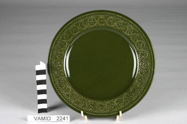 Piatto da frutta circolare color verde scuro con motivi decorativi geometrici e vegetali a rilievo lungo la tesa.