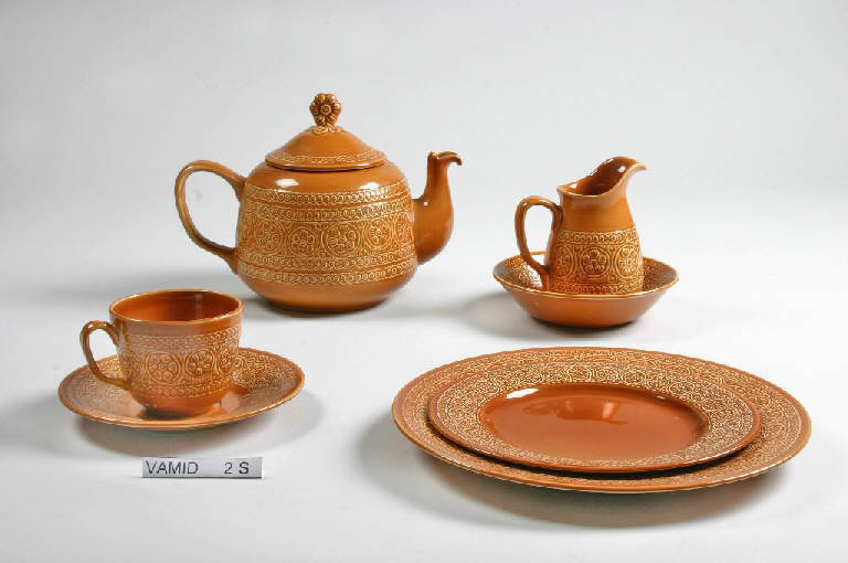 Servizio da thè composto da un piattino, due tazze, una ciotola portadolci, una lattiera e una teiera con coperchio; fondo color giallo aranciato; motivi geometrici e vegetali a rilievo lungo i bordi.