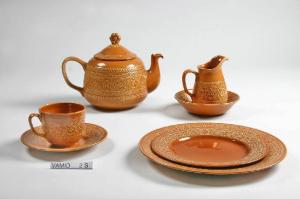 Servizio da tavola composto da un piatto da frutta, un piatto piano e un'antipastiera; fondo color giallo aranciato; motivi decorativi geometrici e vegetali a rilievo lungo il bordo.