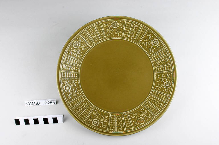 Piatto piano interamente smaltato in verde scuro con tesa decorata a rilievo.