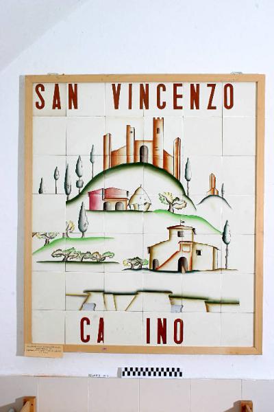 - NOTIZIE STORICO CRITICHE Il pannello in esame fa parte di un gigantesca composizione di piastrelle (in totale 23 mq. circa) realizzata nel 1938 per la Mostra dell'Autarchia in Roma, di cui fu l'evento più spettacolare. Nella composizione erano indicate in alto le materie prime e le fonti di energia con le zone di provenienza, tutte rigorosamente italiane (San Vincenzo, Gattinara, Tremenico, Ticino, Vizzola Ticino) e per ognuna Andlovitz uno dei suoi sintetici e gradevolissimi paesaggi. Più in basso sempre Andlovitz aveva illustrato le lavorazioni tecniche della terraglia, stilizzando, con più severità del solito, figure di operai e operaie. Ancora più sotto una veduta complessiva del profilo dei monti e delle fabbriche di Laveno. Secondo altre ipotesi non attendibili, il pannello sarebbe stato eseguito in occasione dell'inaugurazione a Milano della sede del giornale fascista "Il Popolo d'Italia". Esistono delle lettere di corrispondenza tra G. Andlovitz e G. Ponti, nelle quali si parla di un grande pannello da collocarsi a Milano in occasione della venuta di B. Mussolini, il pannello è diverso da quello in esame. Un'altra supposizione, anch'essa non attendibile, è che il pannello sia stato esposto a una fiera campionaria a Milano per celebrare la posa in opera del famosissimo forno tedesco Dresler nella fabbrica di Laveno (cfr. scheda cartacea 2560-2562 di Reggiori, Sarzilla). Dietro ogni piastrella ci sono segni di incollamento su muro con destrina. Le piastrelle in terraglia forte bianca a smalto lucido sono decorate a fuoco di muffola (terzo fuoco o soprasmalto) con colori molto forti come il rosso corallo (oggi non più in uso), il bruno, il blu e il verde. talune parti sono state dipinte con sfumature a pennello. Il lavoro di decorazione è sicuramente stato eseguito presso lo stabilimento Lago nel reparto di Decorazione, allora diretto da Pietro De Ambrosis. Superiormente alla presente veduta del Ticino era scritto su piastrelle "SAN VINCENZO" e in basso "CEMENTO".