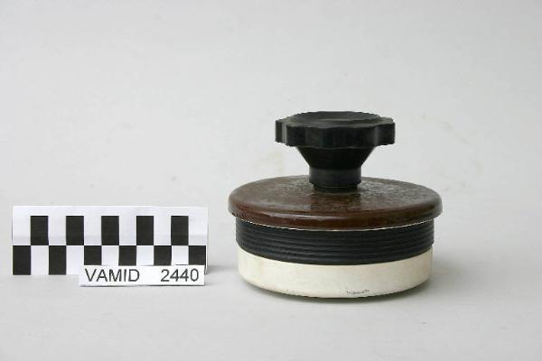 Barattolo cilindrico con due fasce a rilievo bianche su fondo marrone; coperchio ermetico in parte fasciato di gomma e smaltato di marrone e bianco, manopola apicale in gomma nera; internamente vi sono alcune sfere.