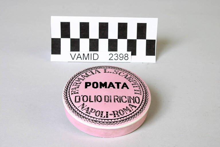 - NOTIZIE STORICO CRITICHE Si tratta di un vasetto per una pomata all'olio di ricino della farmacia Scarpitti di Napoli (coperchio inv. n. 2398, recipiente n. 2399). La decorazione del barattolo, prodotto in serie, è stata realizzata a stampa con transfer di colore nero applicato soprasmalto. La tecnica a stampa si basa sull'incisione di una matrice in rame eseguita per lo più a bulino. La lastra viene poi passata allo stampatore che la spalma a caldo con una miscela di colore e altro che è poi compressa nei solchi dell'incisione con un tampone. Pulita la lastra con stracci di lino, la si imprime con il torchio su una carta speciale, la "carta di riso". La carta di riso stampata viene poi applicata (solitamente da mani femminili con pinzette, spignette intrise d'acqua e altro) e premuta con un rullo di panno sul pezzo ceramico. Si procede poi allo stacco della carta con una spugna bagnata oppure per immersione in acqua. L'oggetto è quindi pronto per essere sottoposto ai normali processi di cottura ceramica.