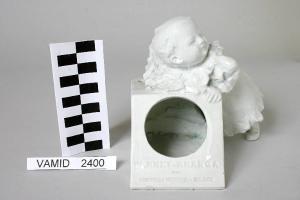 Calamio formato da un recipiente quadrangolare con apertura circolare, su cui è appoggiato un bambino piccolo modellato in terraglia; interamente smaltato di bianco.
