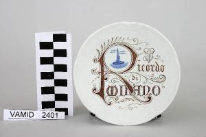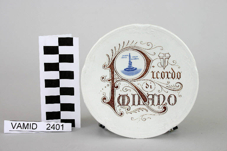 - NOTIZIE STORICO CRITICHE Il piatto-souvernir, prodotto in serie e decorato a stampa con transfer sottosmalto, fa parte di una gruppo di piatti con diversi monumenti di Milano, raffigurati all'interno della lettera "R". Il Museo ne possiede altri esemplari (nn. inv. 429-433). La tecnica a stampa si basa sull'incisione di una matrice in rame eseguita per lo più a bulino. La lastra viene passata allo stampatore che la spalma a caldo con una miscela di colore e altro che è poi compressa nei solchi dell'incisione con un tampone. Pulita la lastra con stracci di lino, la si imprime con il torchio su una carta speciale, la "carta di riso". La carta di riso stampata viene poi applicata (solitamente da mani femminili con pinzette, spignette intrise d'acqua e altro) e premuta con un rullo di panno sul pezzo ceramico. Si procede poi allo stacco della carta con una spugna bagnata oppure per immersione in acqua. L'oggetto è quindi pronto per essere sottoposto ai normali processi di cottura ceramica.