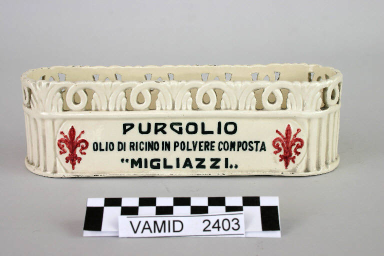 - NOTIZIE STORICO CRITICHE Si tratta di un portapenne fabbricato a scopo commerciale per reclamizzare un prodotto farmaceutico della Ditta Migliazzi, probabilmente di Firenze come attesterebbe la presenza degli stemmi. L'iscrizione è eseguita a mano sottosmalto, come pure la coloritura dei gigli.
