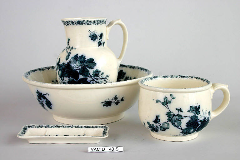 Servizio igienico da camera decorato in blu su fondo bianco e composto da un pitale, una brocca, un portasapone e un catino.