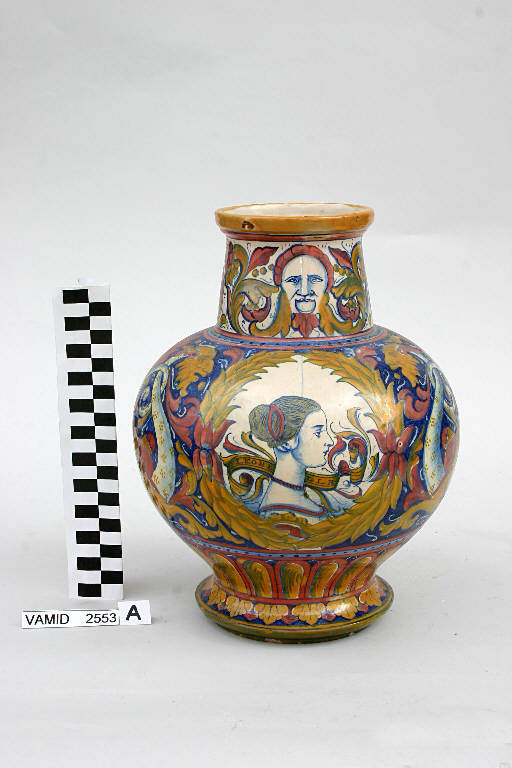 Vaso con largo piede circolare leggermente bombato; corpo globulare con restringimento nella parte in basso; collo a tronco di cono leggermente svasato e imboccatura con bordo estroflesso; decoro con due clipei con teste e decorazioni a ghirlande, mascheroni e baccellature in policromia su fondo in parte bianco e in parte azzurro.