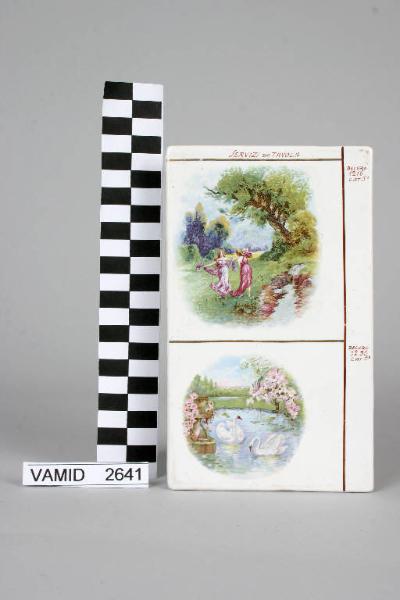 Piastrella suddivisa da linee continue marroni in due riquadri, ciascuno recante un decoro diverso
