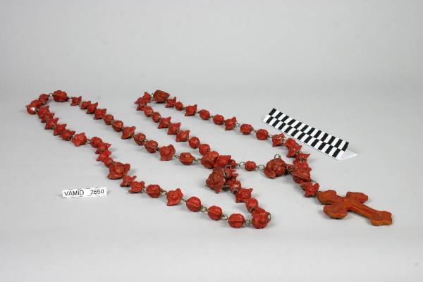 Croce con terminazioni lobate e grani a forma di testine di angioletti.