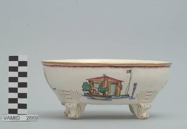 Insalatiera formata da un contenitore a forma ovale con orlo ondulato poggiante su quattro piedini a "C". Il fondo è bianco mentre i decori a smalti policromi sono costituiti sui lati brevi da due raffigurazioni di barche da pesca tipiche del Lago Maggiore, sui lati lunghi da due scorci delle rive del lago. L'orlo è dorato e rifinito esternamente da una piccola fascia smaltata a tratteggio incrociato in rosso, anche i piedini e il loro attacco a rilievo sul corpo del contenitore sono filettati in oro.