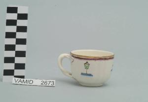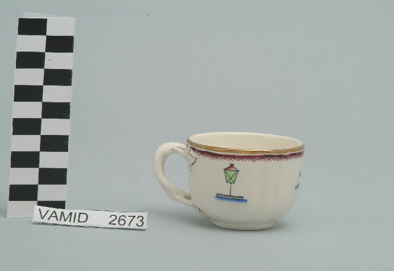 Tazza da caffé con corpo leggermente sagomato a coste rilevate, orlo ondulato e manico formato da due ramoscelli intrecciati che si innestano al corpo mediante foglioline a rilievo. Il fondo è bianco mentre i decori a smalti policromi sono costituiti da tre elementi caratteristici del Lago Maggiore. L'orlo è dorato e rifinito esternamente da una piccola fascia smaltata a tratteggio incrociato in rosso, il manico è evidenziato nelle due linee principali da una profilatura in rosso.