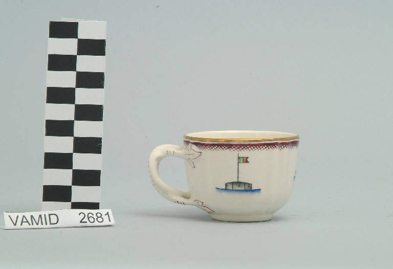 Tazza da caffé con corpo leggermente sagomato a coste rilevate, orlo ondulato e manico formato da due ramoscelli intrecciati che si innestano al corpo mediante foglioline a rilievo. Il fondo è bianco mentre i decori a smalti policromi sono costituiti da tre elementi caratteristici del Lago Maggiore. L'orlo è dorato e rifinito esternamente da una piccola fascia smaltata a tratteggio incrociato in rosso, il manico è evidenziato nelle due linee principali da una profilatura in rosso.