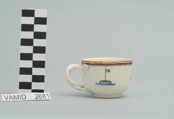 - NOTIZIE STORICO CRITICHE La tazzina da caffé in oggetto fa parte del servizio forma Vecchio Milano con decoro Lago Maggiore: vi sono raffigurati elementi caratteristici del Lago Maggiore (due boe e una barca da pesca tipica, detta burchiello) raffigurati con disegno stilizzato e fresco cromatismo, accentuato dall'uso dell'aerografo ideale per dare ombre e tridimensionalità anche a disegni di piccola dimensione, che conferiscono modernità e curiosità. Fin dalla sua nomina a direttore artistico della SCI, Guido Andlovitz si prefisse di rigenerare le forme tradizionali con decori nuovi. E' il caso della forma "Vecchio Milano" cui adattò nel 1931 il nuovissimo decoro "Lago maggiore", a conferma che una decorazione nuova, se concepita organicamente, può conferire un aspetto attuale e "scattante" anche a una bella forma tradizionale. Fu certamente uno dei servizi più prestigiosi della produzione del momento se Andlovitz lo concepì in piccolissima serie e se l'azienda gli consentì - caso unico- di firmarlo nella marca. La scritta Verbano e la data 1931 presenti nel marchio suggeriscono che probabilmente il servizio fu realizzato per celebrare nel 1931 l'inizio della produzione di porcellana da tavola a Laveno nello stabilimento Verbano. Nell'ambito dei repertori decorativi creati dall'Andlovtz il decoro Lago Maggiore rappresenta un modo frazionato di raffigurare il paesaggio, definito da Mario Munari a "scena spezzata". Nel servizio da caffè i decori sono costituiti da piccoli soggetti connotanti la vita e l''anima' stessa del lago: si tratta di una vasta gamma di minuti, singoli elementi (boe, barche, bandierine sventolanti, pesci, reti...), disegnati in modo semplificato e geometrico ma particolarmente vivace mediante il colore timbrico applicato all'aerografo. Nel decoro Lago maggiore sono presenti espressioni diversificate di un tema molto caro a Guido Andlovitz: i "paesaggi d'acqua" con particolare ricorrenza delle 'barche' raffigurate in una vasta gamma di tipi, generalmente riprese da modelli reali e con divertenti variazioni fantastiche. Il decoro Lago fu applicato in un primo momento sulla forma Vecchio Milano, poi sulla forma Pomezia (1936 ca.). Del decoro Lago esistono diversi disegni originali a matita, pastello, inchiostro e acquerello su carta conservati nel fondo archivistico della SCI: alcuni di questi raffigurano il decoro proprio sulla forma Vecchio Milano con le rifiniture che compaiono sui pezzi finiti. La versione con il manico biforcato, cioè intrecciato come quello nelle tazzine del servizio, venne pubblicata per la prima volta nel catalogo del 1935. Nel Museo è conservato anche un altro servizio forma "Vecchio Milano" con decoro "Lago Maggiore", ma più ridotto nella quantità e nella varietà dei componenti e con filettatura monocroma (num. inv. 2051...3517). Negli anni '90 la Richard Ginori ha rimesso in produzione il servizio Lago.\nIl servizio in esame è eseguito a colaggio, mentre i decori sono realizzati a decalcomania (o transfer): si vedano in proposito le lastre in rame acciaiato conservate nel Museo e raffiguranti molti dei decori presenti nel servizio in combinazioni diversificate (nn. inv. 2480, 2483, 2484, 2485). Tipologicamente si lega ad un servizio da tavola (num. inv. 2667...2911).\nIl servizio è stato donato da Vanna Scotti Meregalli, nipote di Vanna Scotti, figlia dell'Ing. Luciano Scotti che fu direttore generale della SCI dal 1916.