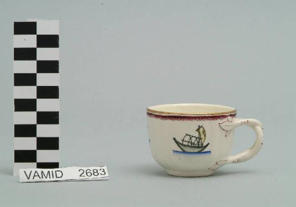 - NOTIZIE STORICO CRITICHE La tazzina da caffé in oggetto fa parte del servizio forma Vecchio Milano con decoro Lago Maggiore: vi sono raffigurati elementi caratteristici del Lago Maggiore (una boa con bandierina e due barche da pesca tipiche, dette burchielli, viste da diverse angolazioni) raffigurati con disegno stilizzato e fresco cromatismo, accentuato dall'uso dell'aerografo ideale per dare ombre e tridimensionalità anche a disegni di piccola dimensione, che conferiscono modernità e curiosità. Fin dalla sua nomina a direttore artistico della SCI, Guido Andlovitz si prefisse di rigenerare le forme tradizionali con decori nuovi. E' il caso della forma "Vecchio Milano" cui adattò nel 1931 il nuovissimo decoro "Lago maggiore", a conferma che una decorazione nuova, se concepita organicamente, può conferire un aspetto attuale e "scattante" anche a una bella forma tradizionale. Fu certamente uno dei servizi più prestigiosi della produzione del momento se Andlovitz lo concepì in piccolissima serie e se l'azienda gli consentì - caso unico- di firmarlo nella marca. La scritta Verbano e la data 1931 presenti nel marchio suggeriscono che probabilmente il servizio fu realizzato per celebrare nel 1931 l'inizio della produzione di porcellana da tavola a Laveno nello stabilimento Verbano. Nell'ambito dei repertori decorativi creati dall'Andlovtz il decoro Lago Maggiore rappresenta un modo frazionato di raffigurare il paesaggio, definito da Mario Munari a "scena spezzata". Nel servizio da caffè i decori sono costituiti da piccoli soggetti connotanti la vita e l''anima' stessa del lago: si tratta di una vasta gamma di minuti, singoli elementi (boe, barche, bandierine sventolanti, pesci, reti...), disegnati in modo semplificato e geometrico ma particolarmente vivace mediante il colore timbrico applicato all'aerografo. Nel decoro Lago maggiore sono presenti espressioni diversificate di un tema molto caro a Guido Andlovitz: i "paesaggi d'acqua" con particolare ricorrenza delle 'barche' raffigurate in una vasta gamma di tipi, generalmente riprese da modelli reali e con divertenti variazioni fantastiche. Il decoro Lago fu applicato in un primo momento sulla forma Vecchio Milano, poi sulla forma Pomezia (1936 ca.). Del decoro Lago esistono diversi disegni originali a matita, pastello, inchiostro e acquerello su carta conservati nel fondo archivistico della SCI: alcuni di questi raffigurano il decoro proprio sulla forma Vecchio Milano con le rifiniture che compaiono sui pezzi finiti. La versione con il manico biforcato, cioè intrecciato come quello nelle tazzine del servizio, venne pubblicata per la prima volta nel catalogo del 1935. Nel Museo è conservato anche un altro servizio forma "Vecchio Milano" con decoro "Lago Maggiore", ma più ridotto nella quantità e nella varietà dei componenti e con filettatura monocroma (num. inv. 2051...3517). Negli anni '90 la Richard Ginori ha rimesso in produzione il servizio Lago.\nIl servizio in esame è eseguito a colaggio, mentre i decori sono realizzati a decalcomania (o transfer): si vedano in proposito le lastre in rame acciaiato conservate nel Museo e raffiguranti molti dei decori presenti nel servizio in combinazioni diversificate (nn. inv. 2480, 2483, 2484, 2485). Tipologicamente si lega ad un servizio da tavola (num. inv. 2667...2911).\nIl servizio è stato donato da Vanna Scotti Meregalli, nipote di Vanna Scotti, figlia dell'Ing. Luciano Scotti che fu direttore generale della SCI dal 1916.