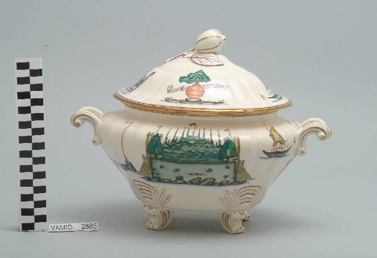 Zuppiera formata da un contenitore a forma ovale con corpo sagomato e panciuto e l'orlo estroflesso e ondulato. Il recipiente poggia su quattro piedini a voluta a "C" ed è fornito di due manici, anch'essi a "C", applicati sui lati brevi. Il coperchio presenta una bombatura pronunciata e un frutto modellato a tutto tondo come presa apicale. Il fondo è bianco mentre i decori a smalti policromi sono distribuiti sulle due facce principali del recipiente e sulla superficie esterna del coperchio. Gli orli sono dorati e rifiniti esternamente da una piccola fascia smaltata a tratteggio incrociato in rosso; anche i piedini, i loro attacchi a rilievo a forma di foglie e i manici sono rifiniti con filettature in rosso e in oro.